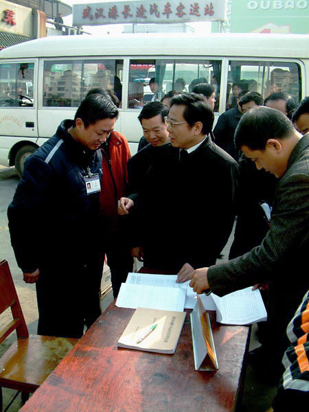 2007年2月11日,春运工作进入第九天,时逢农历小年,武汉市政府副市长带领市春运办、公安、消防、食品卫生等部门的领导,来到武汉港长途汽车客运站检查春运安全工作。